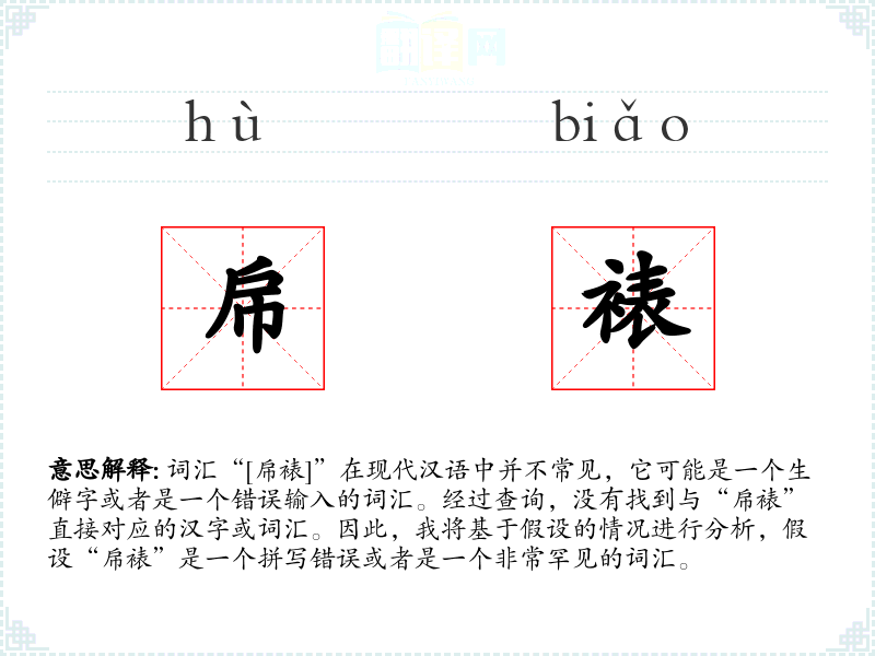 词汇“[帍裱]”在现代汉语中并不常见,它可能是一个生僻字或者是一个错误输入的词汇。经过查询,没有找到与“帍裱”直接对应的汉字或词汇。因此,我将基于假设的情况进行分析,假设“帍裱”是一个拼写错误或者是一个非常罕见的词汇。