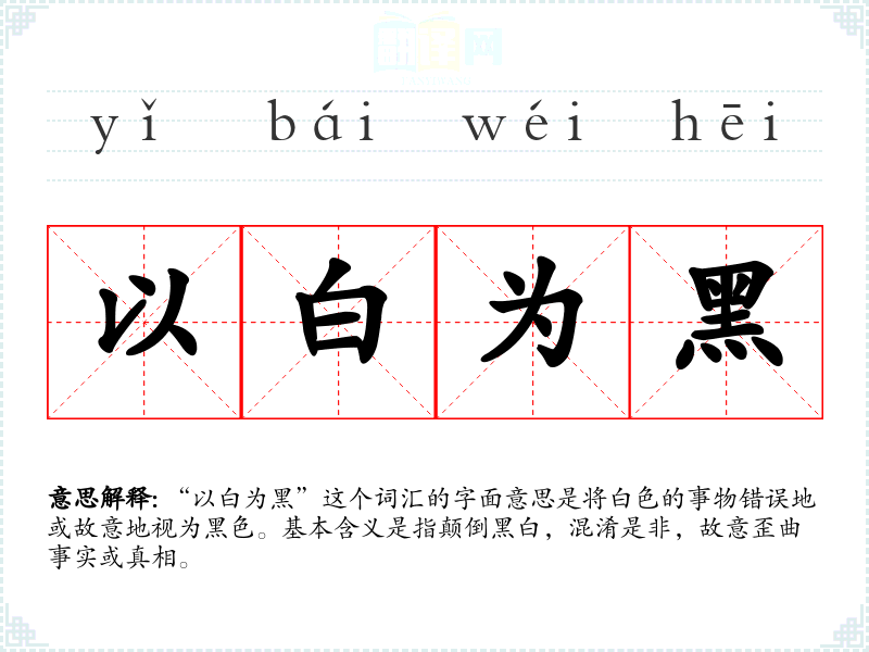 “以白为黑”这个词汇的字面意思是将白色的事物错误地或故意地视为黑色。基本含义是指颠倒黑白,混淆是非,故意歪曲事实或真相。