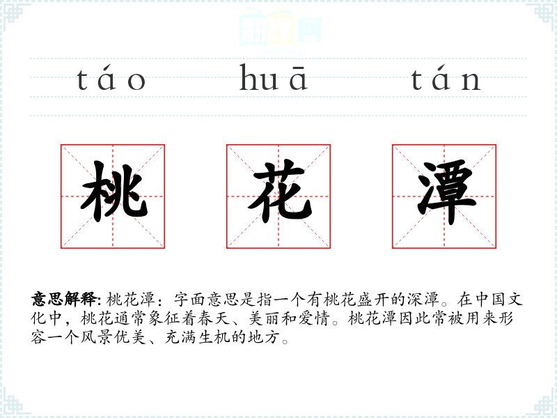 桃花潭:字面意思是指一个有桃花盛开的深潭。在**文化中,桃花通常象征着春天、美丽和爱情。桃花潭因此常被用来形容一个风景优美、充满生机的地方。