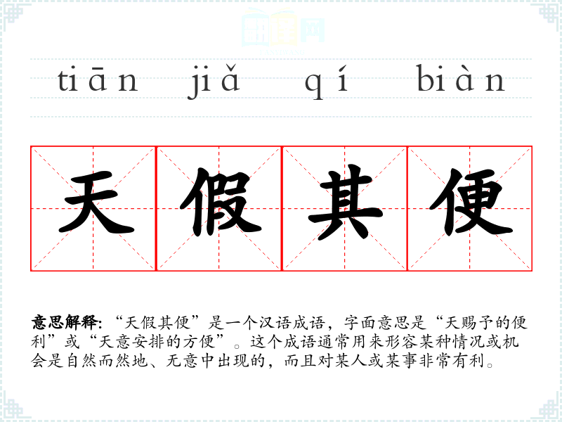 “天假其便”是一个汉语成语,字面意思是“天赐予的便利”或“天意安排的方便”。这个成语通常用来形容某种情况或机会是自然而然地、无意中出现的,而且对某人或某事非常有利。