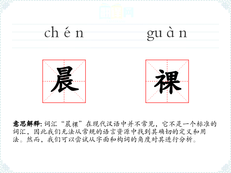 词汇“晨祼”在现代汉语中并不常见,它不是一个标准的词汇,因此我们无法从常规的语言资源中找到其确切的定义和用法。然而,我们可以尝试从字面和构词的角度对其进行分析。