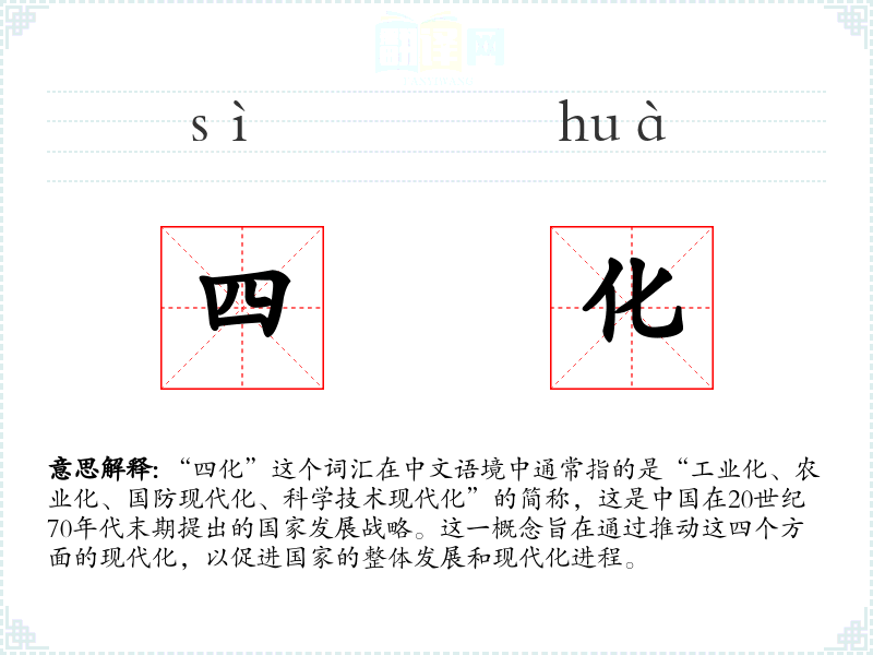 “四化”这个词汇在中文语境中通常指的是“工业化、农业化、国防现代化、科学技术现代化”的简称,这是**在20世纪70年代末期提出的国家发展战略。这一概念旨在通过推动这四个方面的现代化,以促进国家的整体发展和现代化进程。