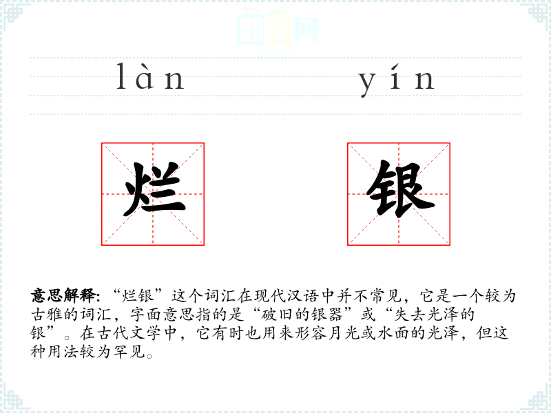 “烂银”这个词汇在现代汉语中并不常见,它是一个较为古雅的词汇,字面意思指的是“破旧的银器”或“失去光泽的银”。在古代文学中,它有时也用来形容月光或水面的光泽,但这种用法较为罕见。