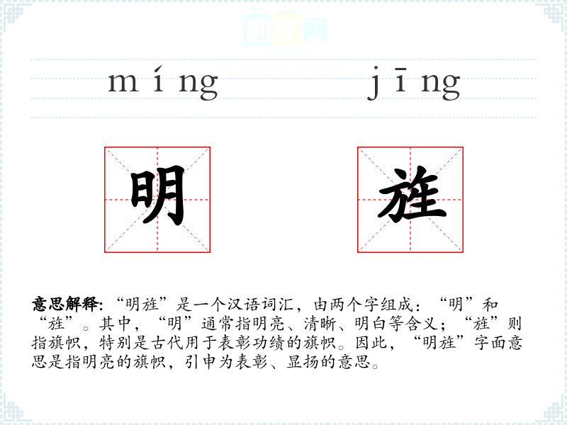 “明旌”是一个富有历史和文化内涵的词汇,它不仅代表了古代的表彰制度,也象征着荣誉和成就。在语言学*和表达中,理解和运用这样的词汇可以丰富我们的表达方式,增强语言的深度和广度。