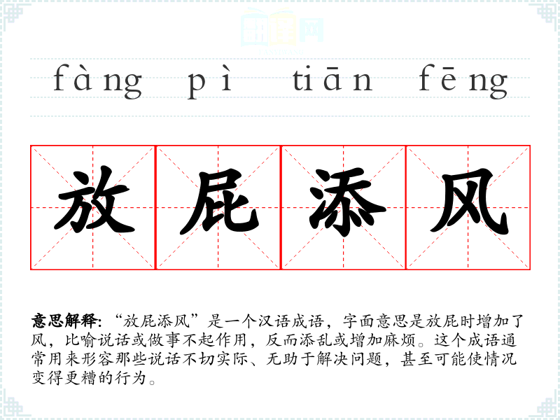 “放屁添风”是一个汉语成语,字面意思是放屁时增加了风,比喻说话或做事不起作用,反而添乱或增加麻烦。这个成语通常用来形容那些说话不切实际、无助于解决问题,甚至可能使情况变得更糟的行为。