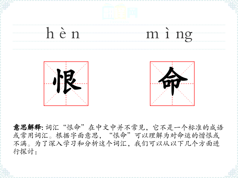 词汇“恨命”在中文中并不常见,它不是一个标准的成语或常用词汇。根据字面意思,“恨命”可以理解为对命运的憎恨或不满。为了深入学*和分析这个词汇,我们可以从以下几个方面进行探讨: