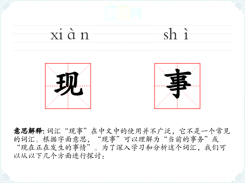 词汇“现事”在中文中的使用并不广泛,它不是一个常见的词汇。根据字面意思,“现事”可以理解为“当前的事务”或“现在正在发生的事情”。为了深入学*和分析这个词汇,我们可以从以下几个方面进行探讨: