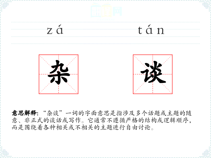 同义词:闲聊、漫谈、随笔、杂议 反义词:正式讨论、学术论文、专业报告