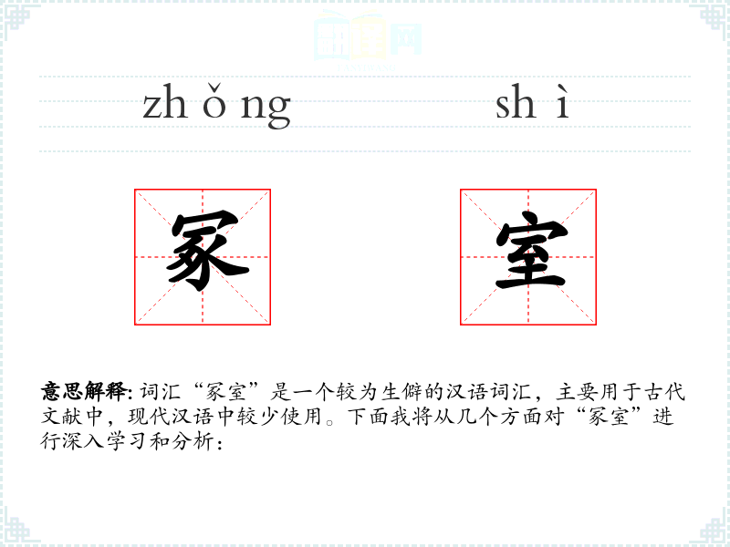 词汇“冢室”是一个较为生僻的汉语词汇,主要用于古代文献中,现代汉语中较少使用。下面我将从几个方面对“冢室”进行深入学*和分析: