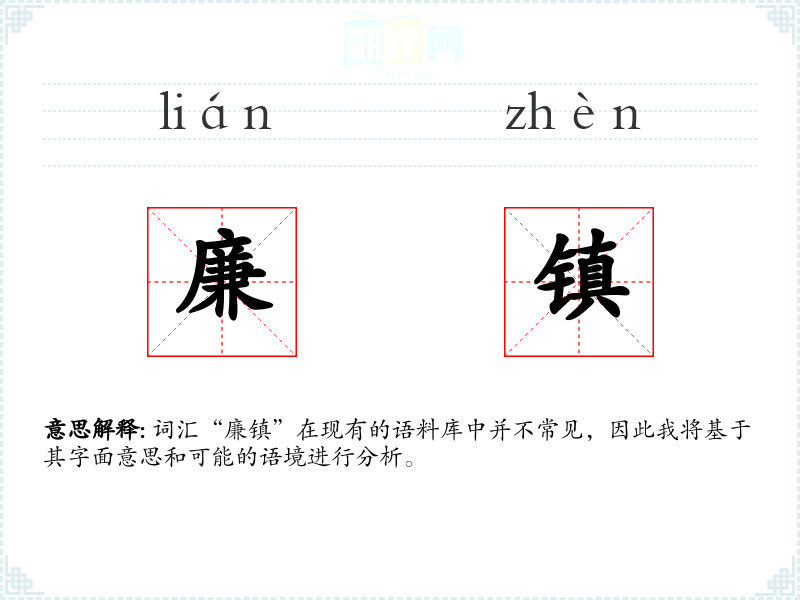 词汇“廉镇”在现有的语料库中并不常见,因此我将基于其字面意思和可能的语境进行分析。