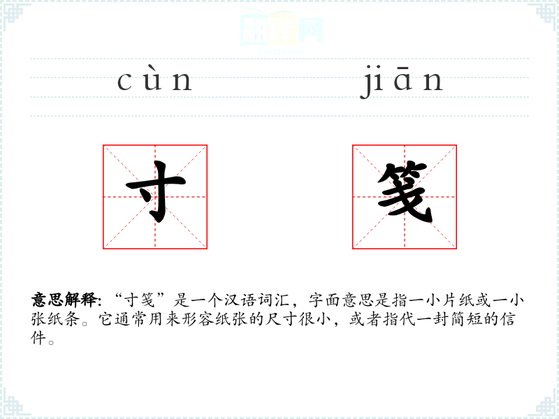 “寸笺”是一个汉语词汇,字面意思是指一小片纸或一小张纸条。它通常用来形容纸张的尺寸很小,或者指代一封简短的信件。