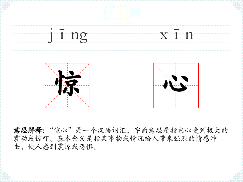 “惊心”一词的词源较为直接,由“惊”和“心”两个字组成,分别表示“惊吓”和“内心”。在古代汉语中,它就已经存在,并且在现代汉语中仍然广泛使用,没有发生太大的语义变化。