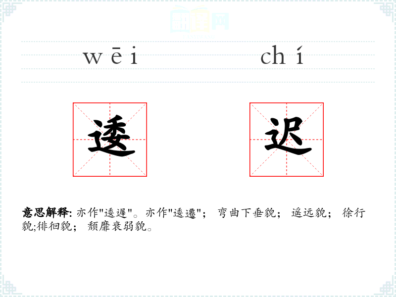 亦作"逶遟"。亦作"逶遷"; 弯曲下垂貌; 遥远貌; 徐行貌;徘徊貌; 颓靡衰弱貌。