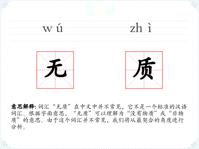 词汇“无质”在中文中并不常见,它不是一个标准的汉语词汇。根据字面意思,“无质”可以理解为“没有物质”或“非物质”的意思。由于这个词汇并不常见,我们将从最契合的角度进行分析。