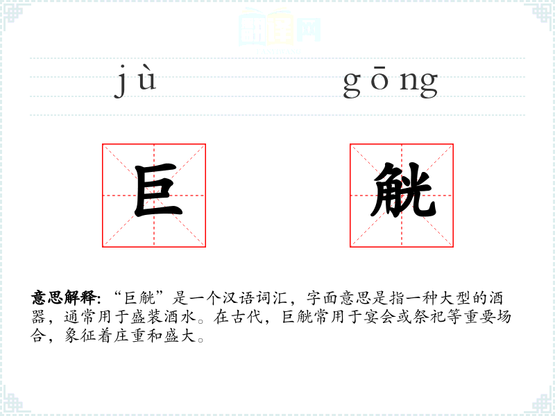 “巨觥”是一个汉语词汇,字面意思是指一种大型的酒器,通常用于盛装酒水。在古代,巨觥常用于宴会或祭祀等重要场合,象征着庄重和盛大。