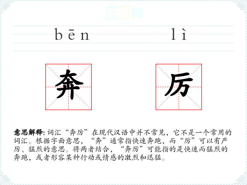 词汇“奔厉”在现代汉语中并不常见,它不是一个常用的词汇。根据字面意思,“奔”通常指快速奔跑,而“厉”可以有严厉、猛烈的意思。将两者结合,“奔厉”可能指的是快速而猛烈的奔跑,或者形容某种行动或情感的激烈和迅猛。