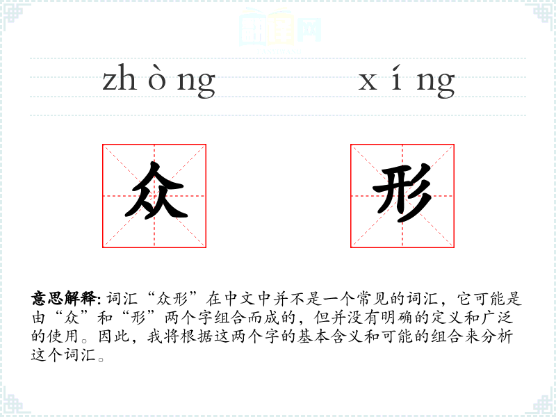 词汇“众形”在中文中并不是一个常见的词汇,它可能是由“众”和“形”两个字组合而成的,但并没有明确的定义和广泛的使用。因此,我将根据这两个字的基本含义和可能的组合来分析这个词汇。
