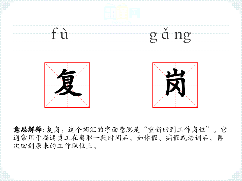 复岗:这个词汇的字面意思是“重新回到工作岗位”。它通常用于描述员工在离职一段时间后,如休假、病假或培训后,再次回到原来的工作职位上。