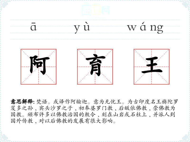 1.梵语。或译作阿输迦。意为无忧王。为古印度名王旃陀罗笈多之孙﹐宾头沙罗之子﹐初奉婆罗门教﹐后皈依佛教﹐崇佛教为国教。颁布许多以佛教治国的敕令﹐刻在山岩或石柱上﹐并派人到国外传教﹐对以后佛教的发展有很大影响。