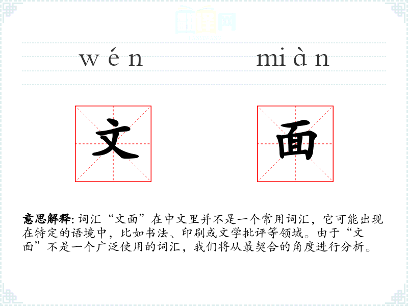 - 书法:在书法领域,“文面”可能指书法作品的外观,包括笔画的粗细、布局的美感等。
