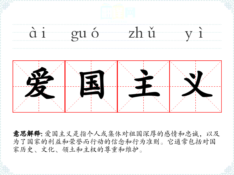 爱国主义是指个人或集体对祖国深厚的感情和忠诚,以及为了国家的利益和荣誉而行动的信念和行为准则。它通常包括对国家历史、文化、领土和主权的尊重和维护。