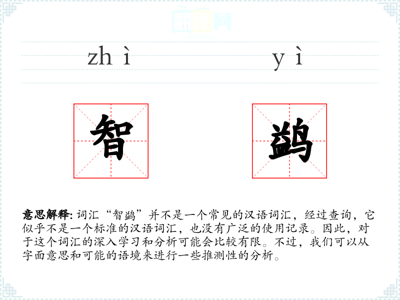 词汇“智鹢”并不是一个常见的汉语词汇,经过查询,它似乎不是一个标准的汉语词汇,也没有广泛的使用记录。因此,对于这个词汇的深入学习和分析可能会比较有限。不过,我们可以从字面意思和可能的语境来进行一些推测性的分析。