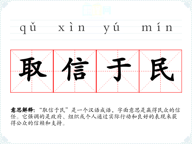 “取信于民”是一个汉语成语,字面意思是赢得民众的信任。它强调的是政府、组织或个人通过实际行动和良好的表现来获得公众的信赖和支持。