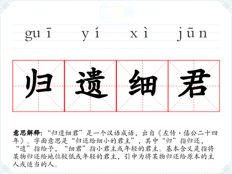 “归遗细君”是一个汉语成语,出自《左传·僖公二十四年》。字面意思是“归还给细小的君主”,其中“归”指归还,“遗”指给予,“细君”指小君主或年轻的君主。基本含义是指将某物归还给地位较低或年轻的君主,引申为将某物归还给原本的主人或适当的人。