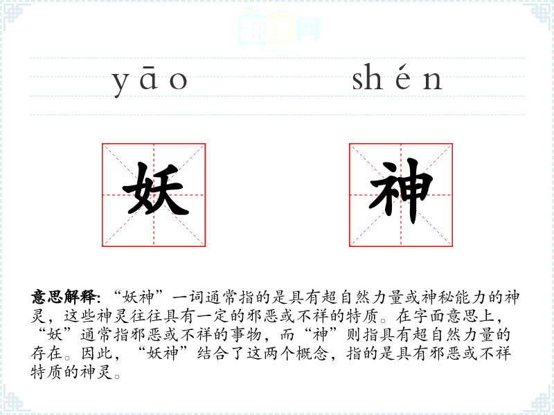 “妖神”一词通常指的是具有超自然力量或神秘能力的神灵,这些神灵往往具有一定的邪恶或不祥的特质。在字面意思上,“妖”通常指邪恶或不祥的事物,而“神”则指具有超自然力量的存在。因此,“妖神”结合了这两个概念,指的是具有邪恶或不祥特质的神灵。