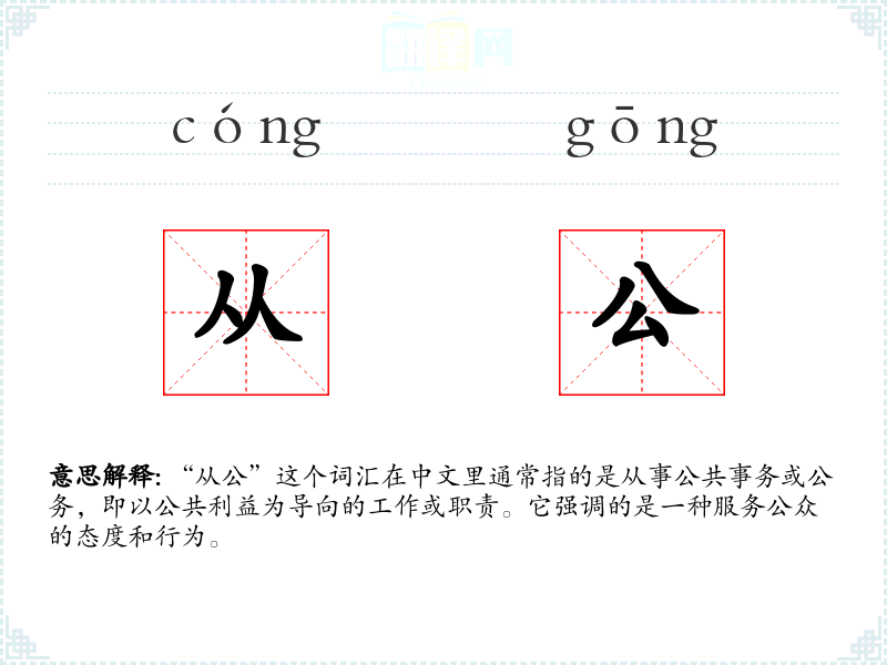 视觉上,“从公”可能让我联想到政府大楼、公共图书馆或社区中心等象征公共服务的建筑。听觉上,可能会联想到官员宣誓或公共服务广告中的庄重语调。