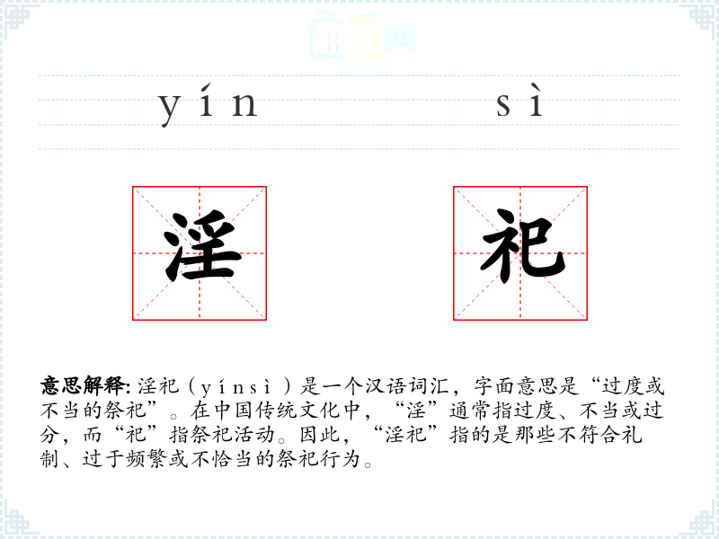 淫祀(yín sì)是一个汉语词汇,字面意思是“过度或不当的祭祀”。在**传统文化中,“淫”通常指过度、不当或过分,而“祀”指祭祀活动。因此,“淫祀”指的是那些不符合礼制、过于频繁或不恰当的祭祀行为。