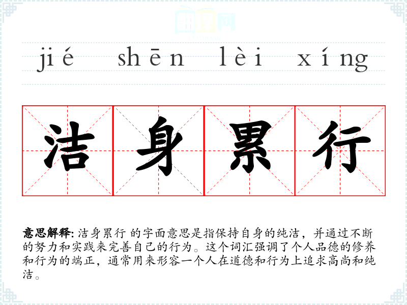 洁身累行 的字面意思是指保持自身的纯洁,并通过不断的努力和实践来完善自己的行为。这个词汇强调了个人品德的修养和行为的端正,通常用来形容一个人在道德和行为上追求高尚和纯洁。