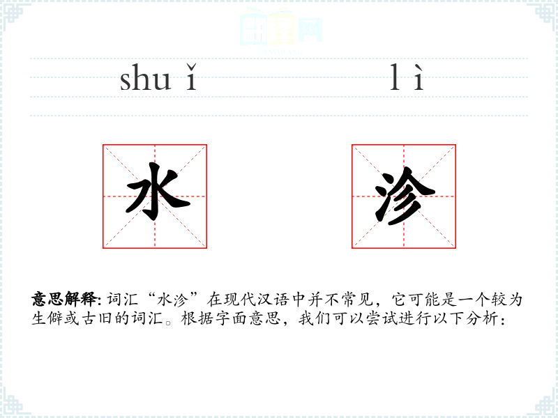 词汇“水沴”在现代汉语中并不常见,它可能是一个较为生僻或古旧的词汇。根据字面意思,我们可以尝试进行以下分析: