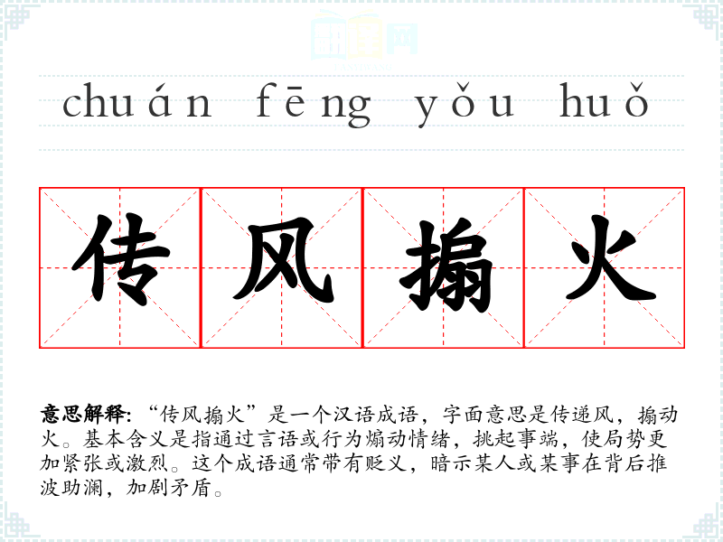 “传风搧火”是一个汉语成语,字面意思是传递风,搧动火。基本含义是指通过言语或行为煽动情绪,挑起事端,使局势更加紧张或激烈。这个成语通常带有贬义,暗示某人或某事在背后推波助澜,加剧矛盾。