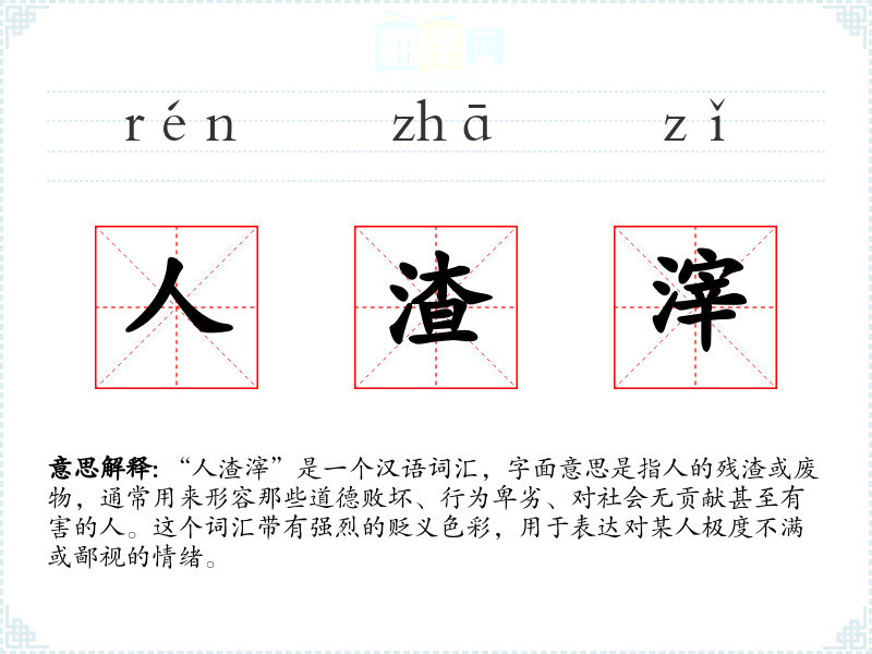 “人渣滓”是一个汉语词汇,字面意思是指人的残渣或废物,通常用来形容那些道德败坏、行为卑劣、对社会无贡献甚至有害的人。这个词汇带有强烈的贬义色彩,用于表达对某人极度不满或鄙视的情绪。