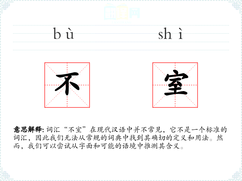 词汇“不室”在现代汉语中并不常见,它不是一个标准的词汇,因此我们无法从常规的词典中找到其确切的定义和用法。然而,我们可以尝试从字面和可能的语境中推测其含义。