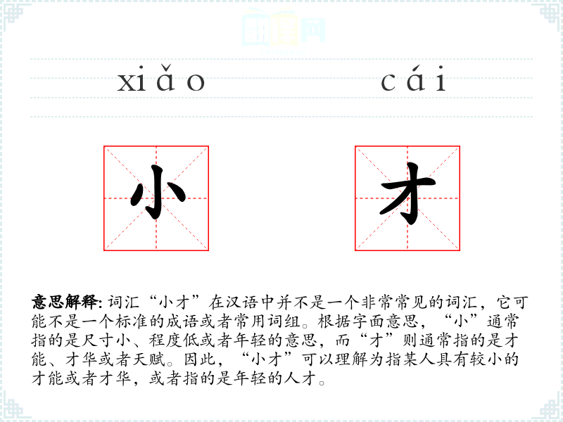 “小才”可以解释为指某人具有有限的才能或者才华,或者指的是年轻的人才,通常带有一定的谦虚或者自谦的意味。