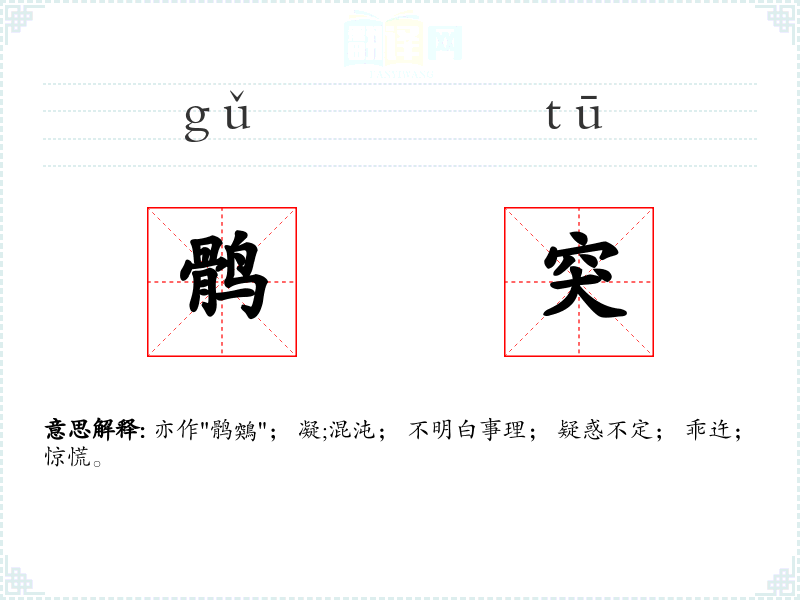 亦作"鹘鶟"; 凝;混沌; 不明白事理; 疑惑不定; 乖迕; 惊慌。