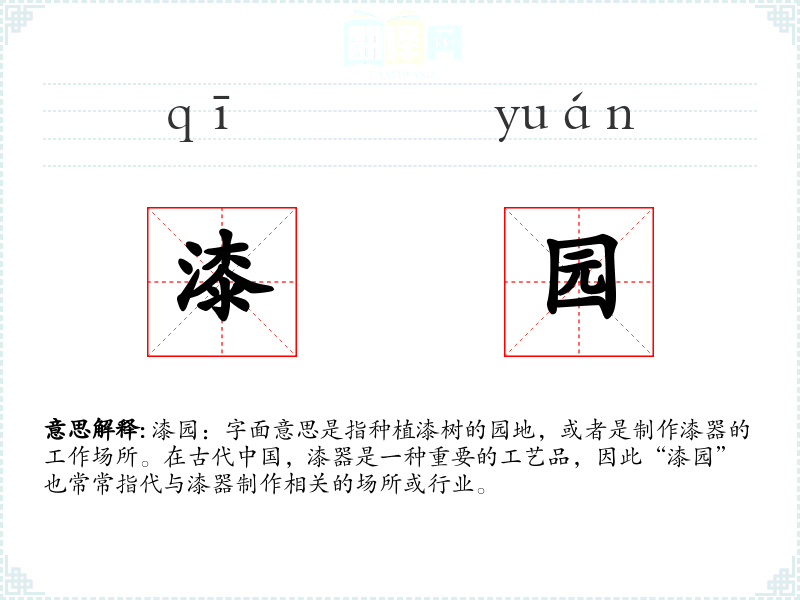 在现代生活中,“漆园”可能不太常见,但如果有机会参观或了解漆器制作的过程,可以更深入地理解这个词的文化内涵。
