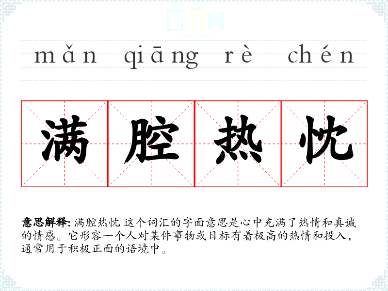 满腔热忱 这个词汇的字面意思是心中充满了热情和真诚的情感。它形容一个人对某件事物或目标有着极高的热情和投入,通常用于积极正面的语境中。