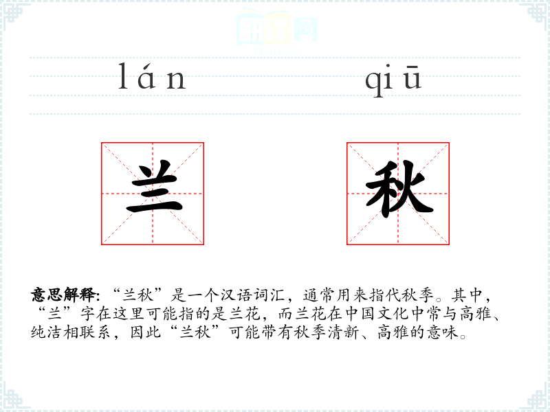 “兰秋”是一个汉语词汇,通常用来指代秋季。其中,“兰”字在这里可能指的是兰花,而兰花在**文化中常与高雅、纯洁相联系,因此“兰秋”可能带有秋季清新、高雅的意味。