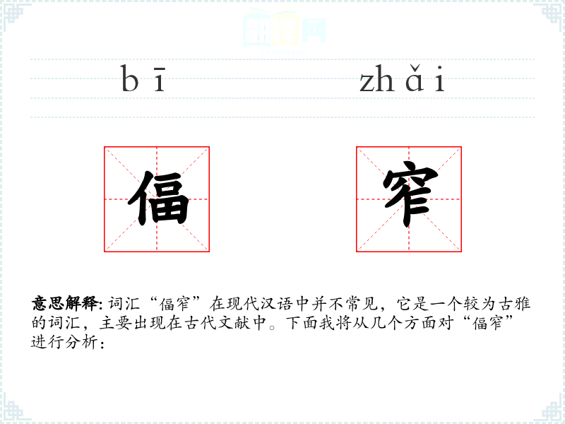 词汇“偪窄”在现代汉语中并不常见,它是一个较为古雅的词汇,主要出现在古代文献中。下面我将从几个方面对“偪窄”进行分析: