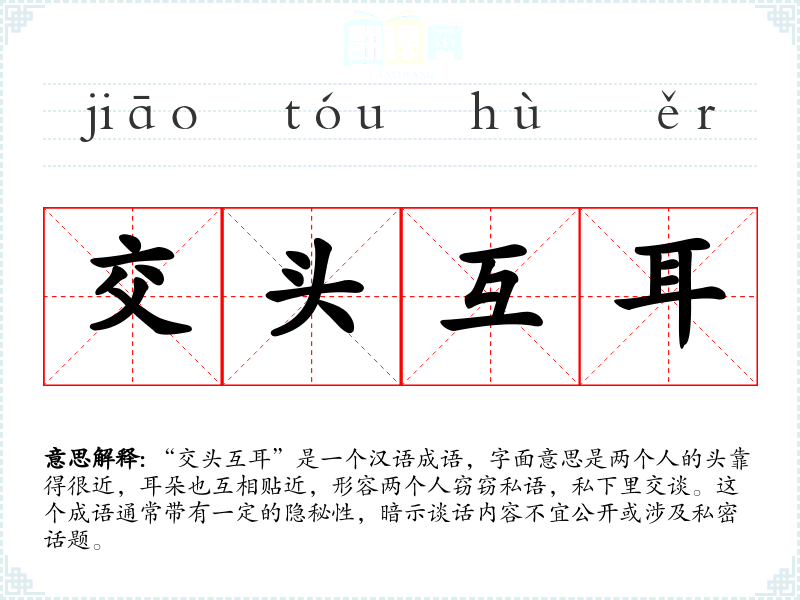 “交头互耳”是一个汉语成语,字面意思是两个人的头靠得很近,耳朵也互相贴近,形容两个人窃窃私语,私下里交谈。这个成语通常带有一定的隐秘性,暗示谈话内容不宜公开或涉及私密话题。
