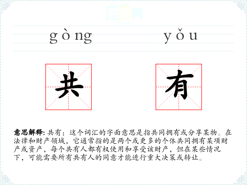 共有:这个词汇的字面意思是指共同拥有或分享某物。在法律和财产领域,它通常指的是两个或更多的个体共同拥有某项财产或资产,每个共有人都有权使用和享受该财产,但在某些情况下,可能需要所有共有人的同意才能进行重大决策或转让。