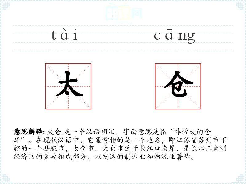 太仓 是一个汉语词汇,字面意思是指“非常大的仓库”。在现代汉语中,它通常指的是一个地名,即江苏省苏州市下辖的一个县级市,太仓市。太仓市位于长江口南岸,是长江三角洲经济区的重要组成部分,以发达的制造业和物流业著称。