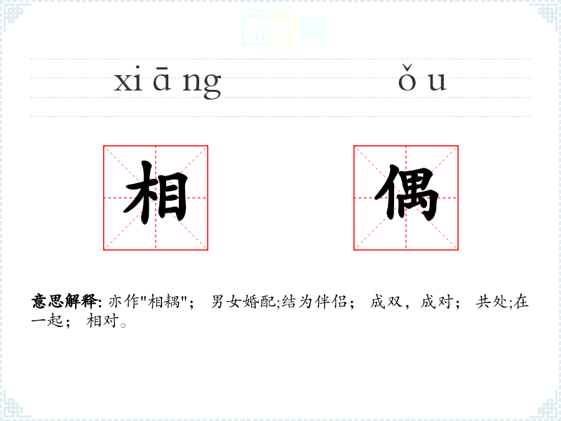 亦作"相耦"; 男女婚配;结为伴侣; 成双,成对; 共处;在一起; 相对。
