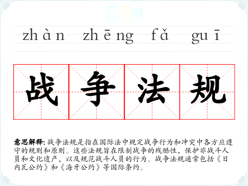 同义词:战争法、国际人道法、武装冲突法 反义词:无(因为战争法规是规范性的,没有直接的反义词)