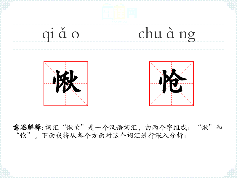 - “愀怆”这个词在汉语中是一个非常有表现力的词汇,它能够精确地传达深沉的悲伤和忧愁。在学*和使用这个词汇时,我更加深刻地理解了汉语的丰富性和细腻性。