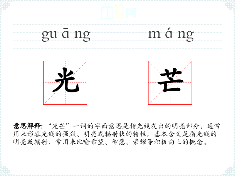 “光芒”一词的词源较为直接,由“光”和“芒”两个字组成。“光”指光线,“芒”指草木的尖端,引申为尖锐、明亮的意思。在古代汉语中,“光芒”常用来形容光线的明亮和辐射状的特性。随着语言的发展,“光芒”也被用来比喻各种积极向上的概念。