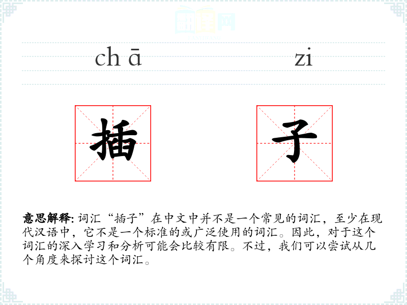 词汇“插子”在中文中并不是一个常见的词汇,至少在现代汉语中,它不是一个标准的或广泛使用的词汇。因此,对于这个词汇的深入学习和分析可能会比较有限。不过,我们可以尝试从几个角度来探讨这个词汇。